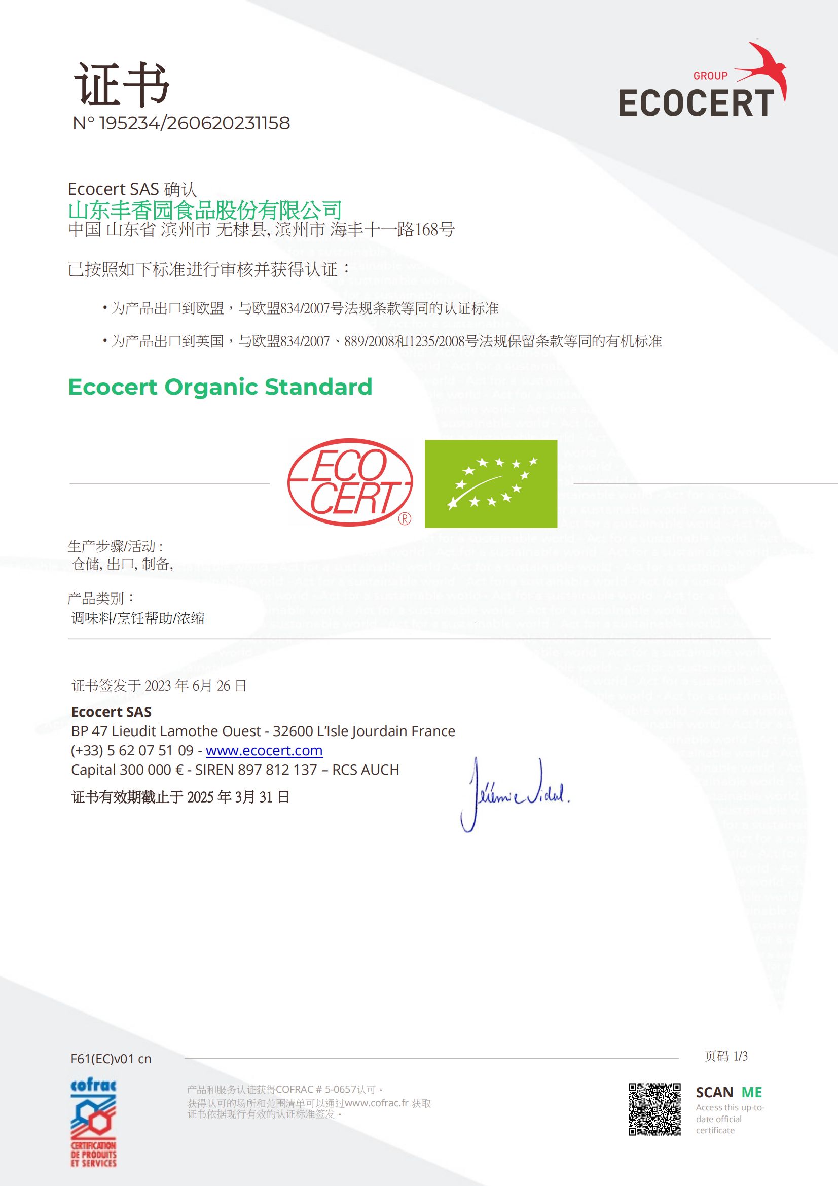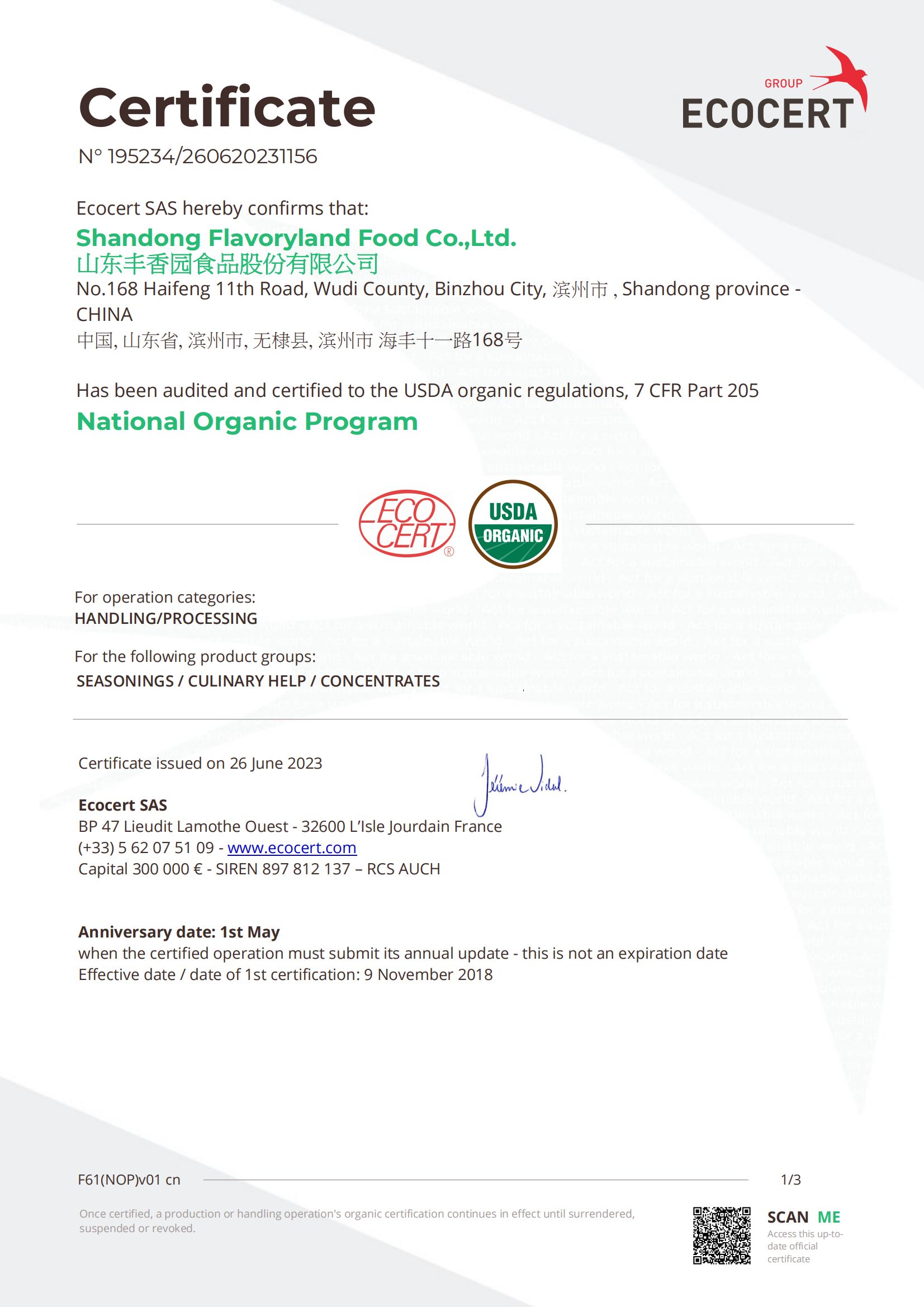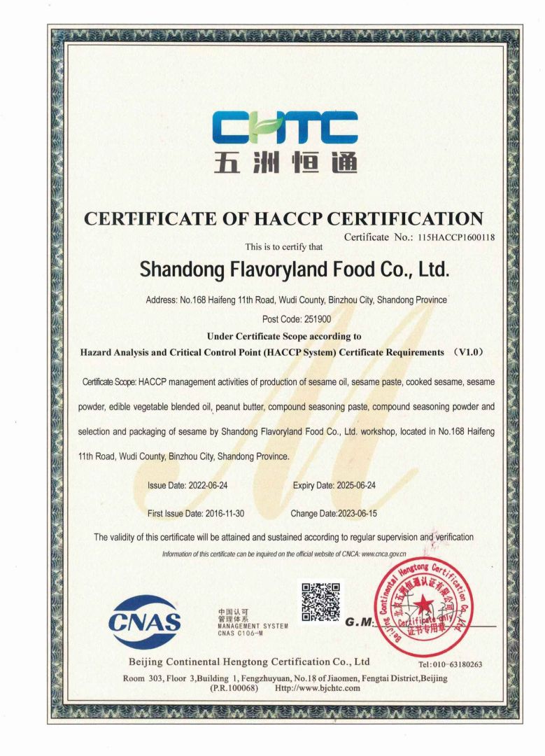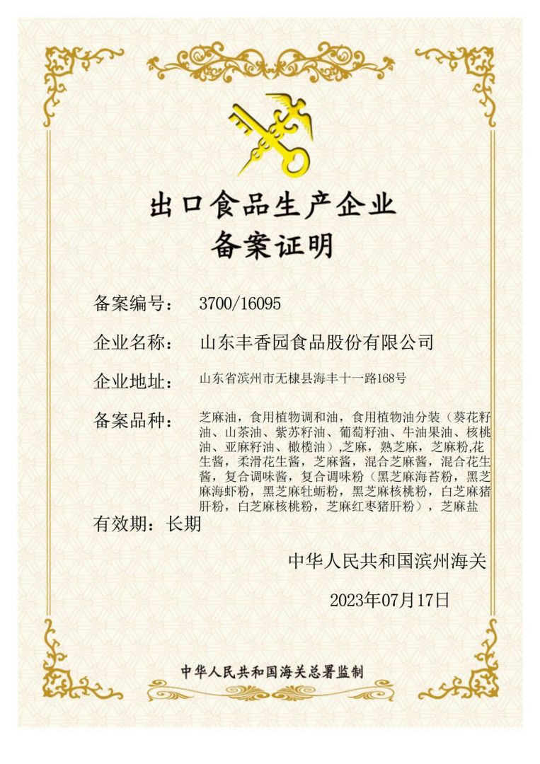? ? 豐香園小磨香油、芝麻調(diào)和油、花生醬、芝麻醬、混合醬、熟芝麻制品均已通過英國零售商協(xié)會BRC認(rèn)證、歐盟 美國和國內(nèi)有機、HACCP體系認(rèn)證,是山東省出口食品備案企業(yè)。